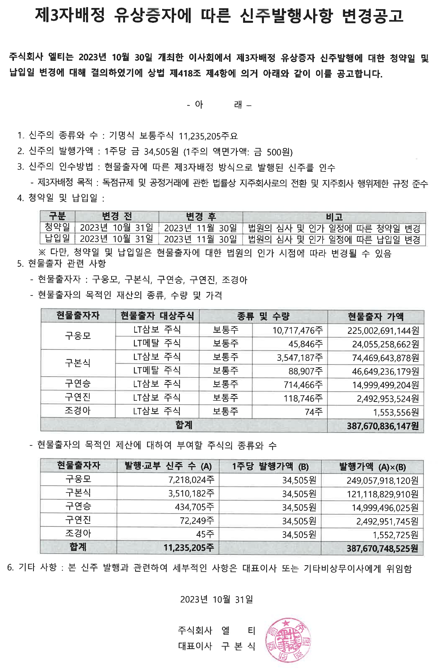 Á¦3ÀÚ¹èÁ¤ À¯»óÁõÀÚ¿¡ µû¸¥ ½ÅÁÖ¹ßÇà»çÇ× º¯°æ°ø°í